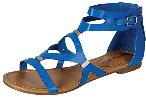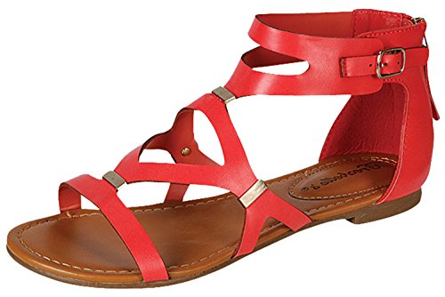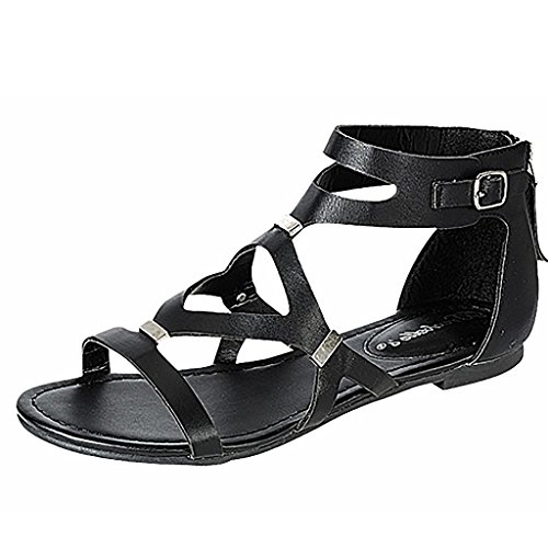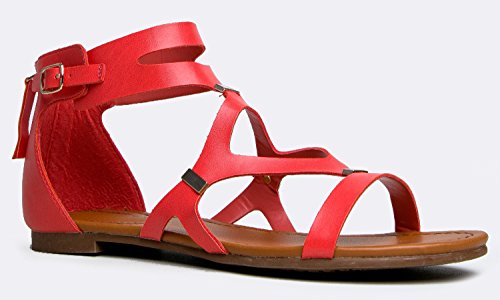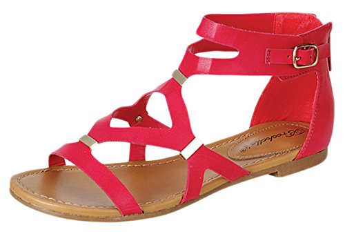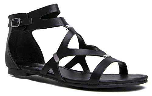 Make your outfit smart with these practical gladiator sandals. Features a cutout leatherette upper with metal insets and a back zipper closure to create the perfect silhouette.