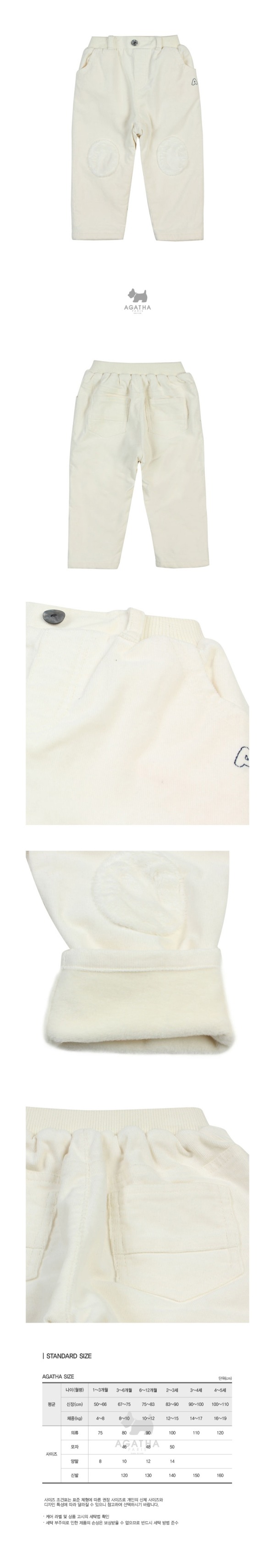 코듀로이 스판 소재를 사용한 배기팬츠로 부드러운 안감을 사용하여 보온성을 높여준 스타일입니다.