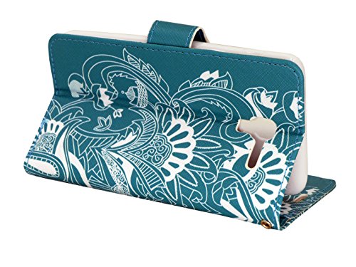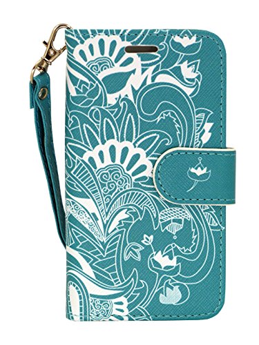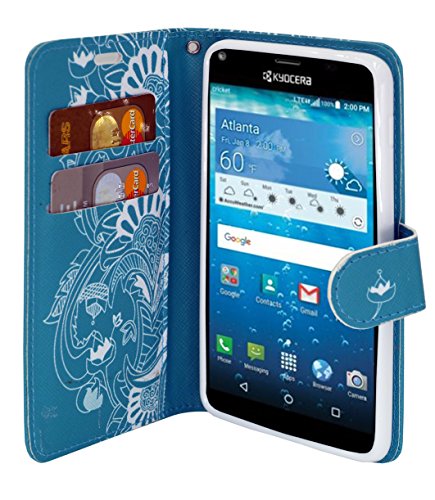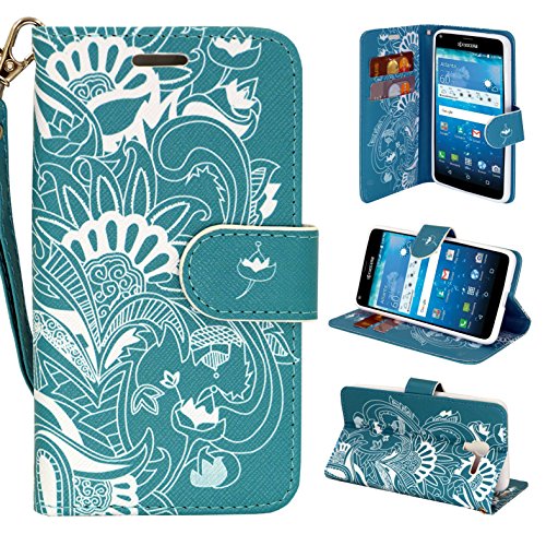 Kyocera Hydro View Case, Customerfirst Magnetic Leather Folio Flip Wallet Pouch With Fold Up Kickstand and Wrist Strap For Kyocera Hydro C6742 With Key Chain (Teal Lotus)