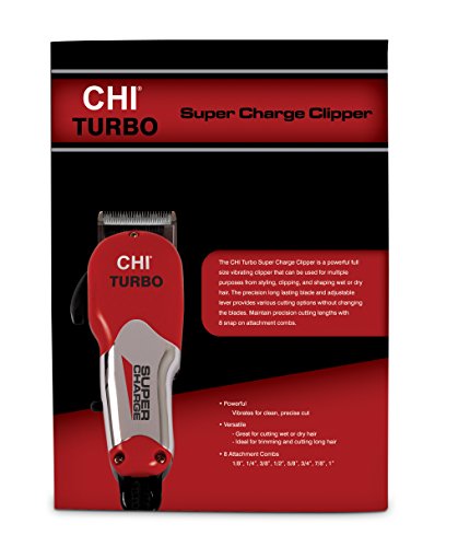 The CHI turbo super charge clipper is a powerful full size vibrating clipper that can be used for multiple purposes from styling, clipping, and shaping wet or dry hair. The precision long lasting blade ad adjustable lever provides various cutting options without changing the blades. Maintain precision cutting lengths with 8 snap on attachment combs.