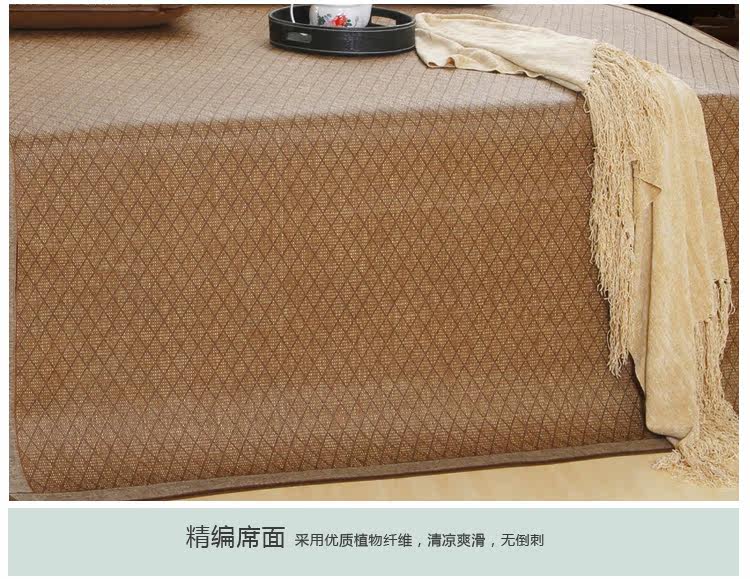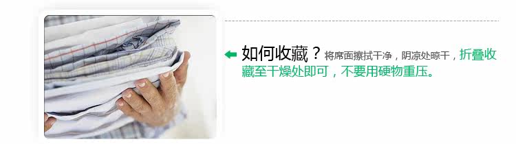 使用前用30℃水温,湿毛巾将席子擦拭干净,晾干后即可使用。使用中经常用毛巾擦拭,保持席面清洁光滑,当空气湿度比较高时,应保持房间通风透气。如果有脏的地方,用中性洗涤剂擦拭。收藏前,将席面擦拭干净,放在透风处晾干,存放在干燥避光处。