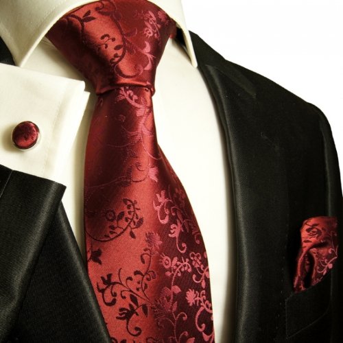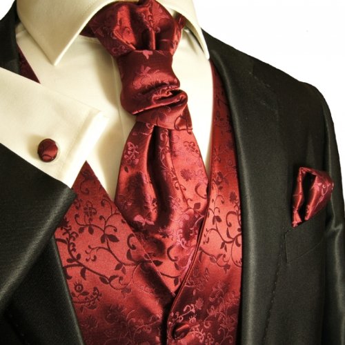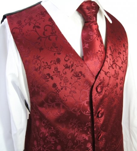 - Feature : Includes: Vest , Necktie, Cravat, Pocket Square, Cufflinks / Excellent Quality / Strap in the back to adjust width / Color: Burgundy Vines / Full Back Tuxedo Vest