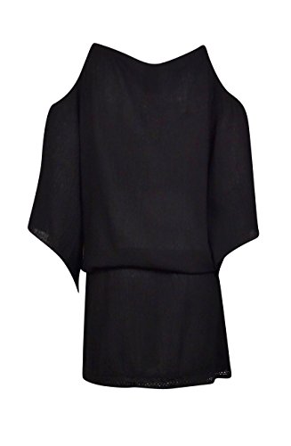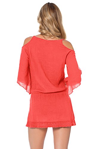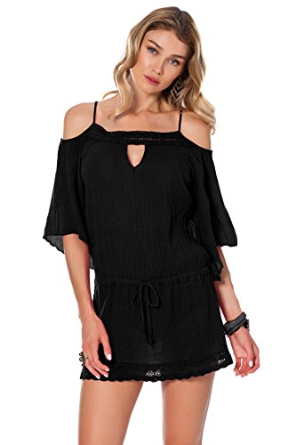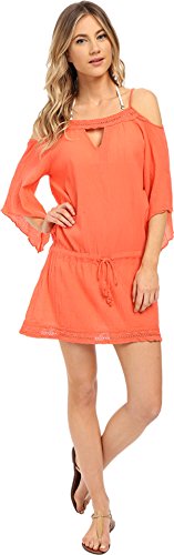 Product DescriptionTivoli gauze cold shoulder tunic features crochet scallop trim, keyhole front, and drawstring waist with crochet scallop tassel.0