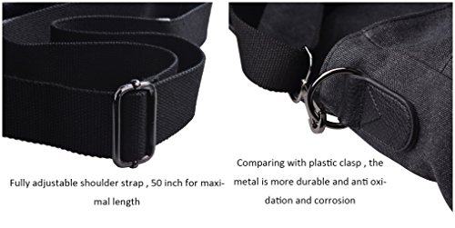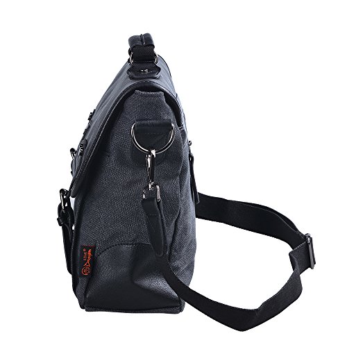 -. Feature : Douguyan messenger bag has been modernized to use magnetic snaps - the metal buckles are just decorative, giving the bag a vintage look. And there's an adjustable shoulder strap that allows the bag to worn over one shoulder with a strap that goes across the chest . Alternatively, the shoulder strap can be removed, with the bag carried as a briefcase with a leather handle. / The bag is made of PU leather and cotton canvas . Due to the water wash process , this bag is hardly to lose color and more durable to use . / Total of 7 various compartments : 1 main compartment with zipper and Magnet snap flap , inside has 2 open pouchs and 1 zipper pouchs . Outside has 2 front zipper pockets , 1 zipper pocket behind . / Approx Dimensions : 14.1"L × 4.7" W × 11.4" H . Fits for 11",12",13",14" inch laptop .Shoulder strap is removable . It can be lengthen up to 50 " maximum / Durable Handles: Carrying handles for this vintage canvas messenger bag made of the same cotton canvas are fixed by high quality hardware, which makes it comfortable to carry. Usually the first thing to break, these handles are reinforced, double-stitched and designed to last.
