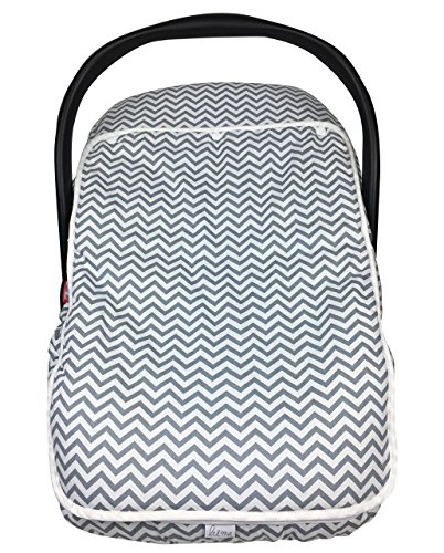 STYLISH UNIVERSAL & SECURE FIT: Trendy fabric - Grey Chevron. Our covers fit most infant car seats and carriers, elasticized bottom ensures they stay secure in place also allowing easy installation and removal. Pullover top stays up secured by 3 snaps even in extreme winds, sheltering baby from elements while transporting outdoors. Safe, backless design as recommended by car seat specialists.