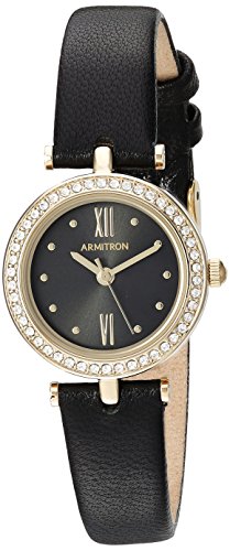 Bezel set with 46 clear swarovski crystals; mineral crystal lens; black sunray dial with gold-tone hands and makers