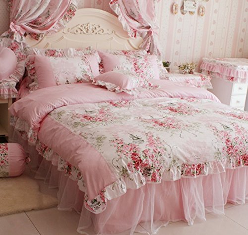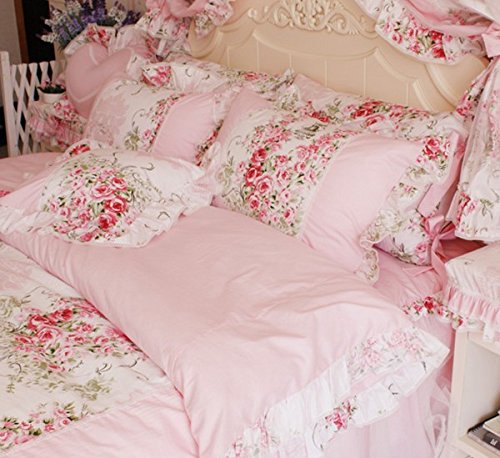 FADFAY Beautiful Rose Floral Print Pillowcases,Korean Lace Ruffle Pillow Shams,2 Pcs (Pink)