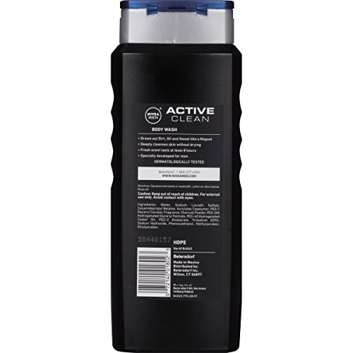-. Binding : Health and Beauty -. Brand : Nivea Men -. EAN : 0072140018023 -. Feature : Deep Cleansing Charcoal Body Wash / Draws out dirt, oil and sweat like a magnet / Deeply cleanses skin without drying / Fresh scent lasts at least 8 hours / Dermatologically tested -. Label : Nivea for Men -. Manufacturer : Nivea for Men -. NumberOfItems : 1 -. PackageQuantity : 1 -. ProductGroup : Pantry -. ProductTypeName : BEAUTY -. Publisher : Nivea for Men -. Studio : Nivea for Men -. Title : Nivea for Men Active Clean Body Wash, Natural Charcoal, 16.9 Fluid Ounce -. UPC : 072140018023