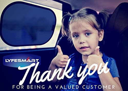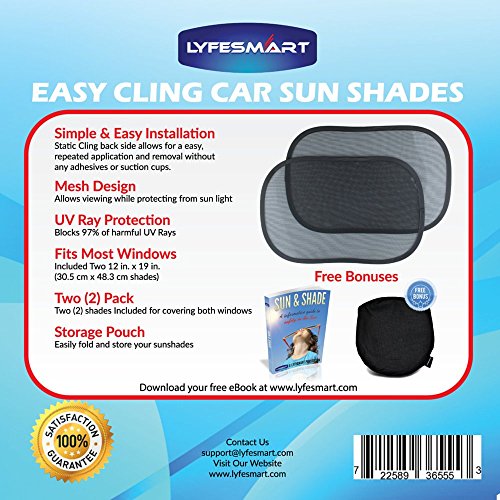 VALUE PACK BUY NOW: Best Value on Amazon, LYFESMART | Easy Cling Car Sun Shades come with 2 Free Bonuses. A Free Premium Pouch to store the shades when not in use. Free E-Book "Sun & Shade" with Tips for keeping your Children Safe in the Heat.