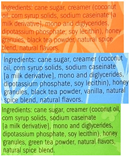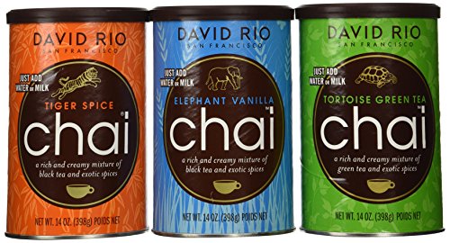 -. Binding : Misc. -. Brand : David Rio -. EAN : 0015400570022 -. Feature : Makes 12 delicious servings per can / Enjoy it hot, iced or blended for a delicious treat / Gluten Free with organic and natural spices / No hydrogenated oil or trans fats / Variety pack for your convenience! -. PackageQuantity : 3 -. ProductGroup : Grocery -. ProductTypeName : GROCERY -. Size : 14 oz -. Title : David Rio Chai Mix, 3 Caniser Variety Pack 14 Oz -. UPC : 015400570022