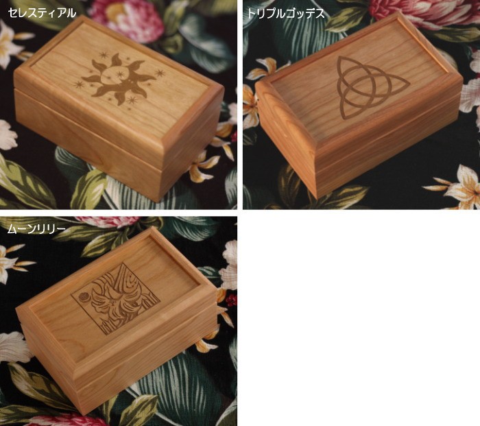 今回発売に至りましたタロットボックスは、Manaオリジナルの国内製造品となります。 セレスティアル、トリプルゴッデス、月とゆり・・・神秘の力が宿ると伝承されてきたシンボルが刻まれています。 タロットカードを保管する目的だけでなく、浄化も兼ねることを図ったウッド製(木製)の高級タロット・ボックスです。 プレゼント利用でも人気となっていまして、贈った方も貰った方にも大変喜ばれています。 | ![]() |