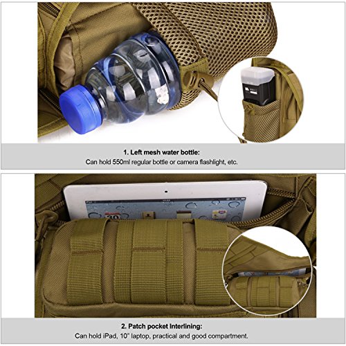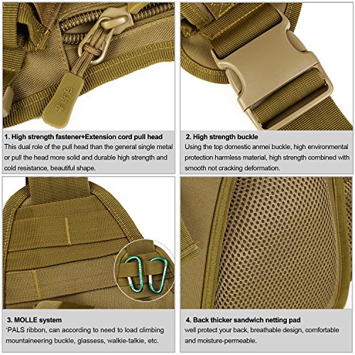 -. Feature : MOLLE external expansion system designed to be used in combination with other equipment, you can load pockets, water bottle bag, accessory kits and other. / Adjustable strap, easy and convenient to adjust to your ideal length. / High intensity nylon buckle and metal, parachute cord + buckle dual pull head / The bag works well with a variety of different outfits and casual styles. / Suitable for Trekking, Hiking Climbing, Camping and other outdoor activities.