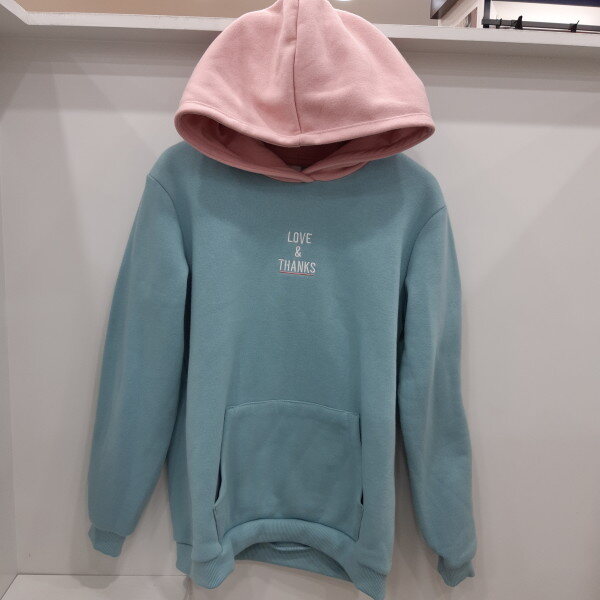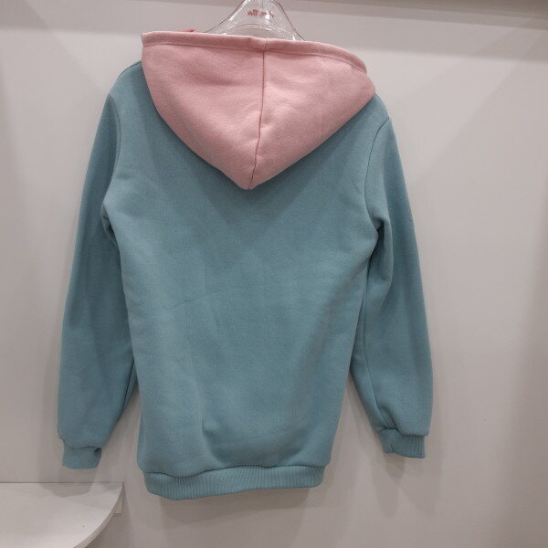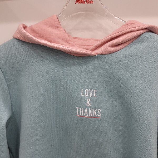 앞면에 자수가 포인트이고 모자가 배색인 후드롱맨투맨