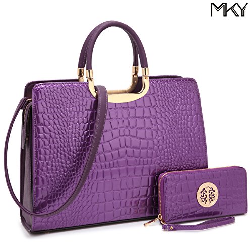 -. Brand : MKY -. Department : womens -. Feature : Top Zipper Closure/Flat Bottom with Gold Tone Studs/Rolled and Stitched Handles -. Model : MKY-XL-02-2828W -. ProductGroup : Shoes -. ProductTypeName : HANDBAG -. Title : Large Leather Satchel Handbag Designer Purse Wallet Set Patent Striped Shoulder Bag
