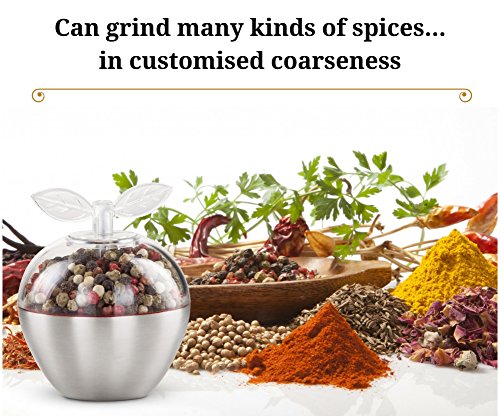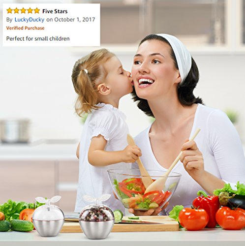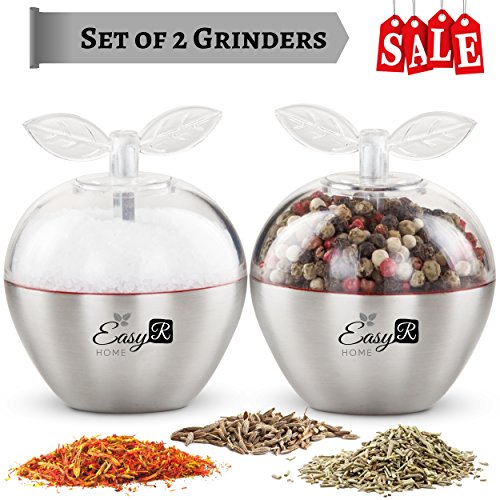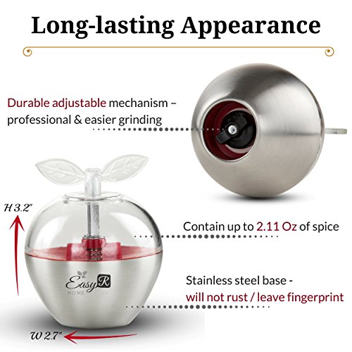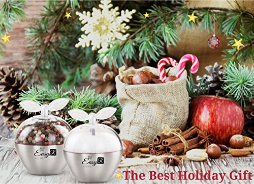 Unique Set of 2 Whimsical Apple-Shaped Salt and Pepper Grinders, Premium Stainless-Steel Dry Spice Mill with Adjustable Ceramic Crank, Refillable Small Dual Shakers Plus FREE eBook by EasyR Home