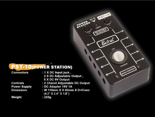 Studio : Kmise Publisher : Kmise Binding : Electronics Product Description this is a 100% new? Genuine Beclat PST-10 Power Station . The PST-10 provides power up your Belcat pedals or other pedals of like power.? It can provide 9V power to as many as 8 devices and has 2 adjustable voltage outputs Connectors:1*DC Input Jack,2*DC Adjustable Output(6v_12V),8*DC 9v Output. Controls:2 Chanel Adjustable DC Output Power Supply fits for?: DC Adapter 15V 1A Dimension: W 110mm * H 60mm * 45mm(2.3"*2.4"*1.8") weight:225g package Include: 1* pst-10 Power Station Only 0
