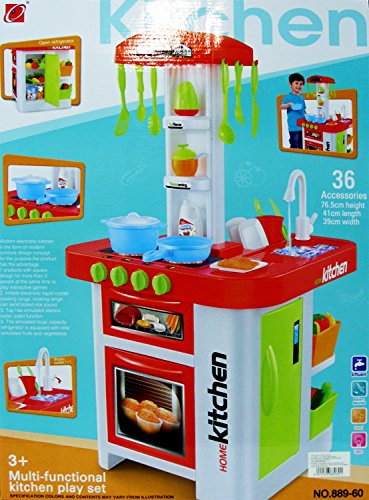 -. Feature : KIDS CAN COOK ALONG WITH MOMMY OR DADDY IN THEIR OWN KITCHEN! This realistic kitchen set allows children to become Little Chefs using their own oven, pots and pans, utensils and more. They can then clean up using their sink with running water (circulating water)! Kids will love using their pots and pans to cook up dinner and then serve them on the plates with utensils just like the adults. / NEW MODERN DESIGN is spacious enough for more than one child to play at a time so that children can play interactively. The kitchen play set, has a counter top that measure 16" high which is the perfect height for children to play with while sitting. Shorter children can play standing or it can be raised onto something for taller children. Whatever position of play a child chooses, the kitchen set will inspire the kids' imaginations, creativity and sociability. / LIGHTS, SOUND & WORKING FAUCET make this kitchen a live fun experience for children. The fridge opens so that the kids can stock their own fridge with fruits, vegetable, milk & orange juice which promotes healthy eating. / WONDERFUL GIFT for the child in your life, whether boy or girl! He/She will be a very lucky child to receive a present such as this realistic kitchen set. / SPECIFICATIONS: Measures approx 30" H (Counter top is approx 16" high) 16" L, 15 ¼" W. Includes; Oven, Convection Oven with doors that open & simulated Electric Cook Top, Refrigerator with door that opens, storage shelves and bins, hanging utensils, counter top, sink with running faucet (insert water into the sink, then open the faucet to circulate the water), pots, pans, dishes, utensils and food items. Battery operated on 3 "AA" batteries (not included). COLORS MAY VARY