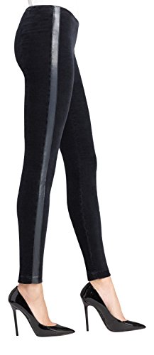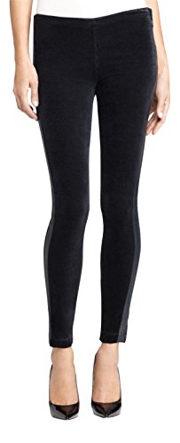 Sexy yet sophisticated tuxedo legging with faux leather trim and a soft velvety feel. Side zip closure. Faux leather tuxedo stripe. Velour fabric.