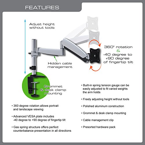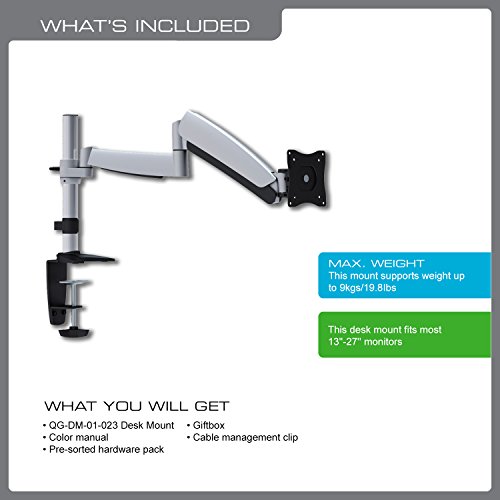 The QualGear QG-DM-01-023 is constructed with solid steel, elegant die casting aluminum and integrated with innovative counterbalance technology. The arm can hold screen up to 9kgs (19.8lbs). Built-in spring tension gauge can be easily adjusted to fit varied weights that arm holds. Advanced VESA plate includes -40 Degree to +90 Degree of fingertip tilt that enable both sit to stand and touch screen applications. The plate also allows 360 Degree landscape to portrait viewing. A hidden cable management integrated in arm easily conceals cables beneath channel covers. In spite of various features, the mounts require really simple installation.