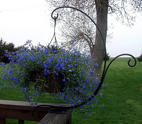 For a simple but impactful touch, add this sturdy wrought iron plant hanger to your wood deck. this beautiful architectural piece will brighten up any area with three hanging plants. sturdy iron is cured under heat to produce a durable black powder-coat finish. attaches easily to your wood deck or rail with screws that are not included. accessories are not included. this item is proudly designed and made in the USA by jandj wire. dimensions are 28"l x 5"w x 32"h.