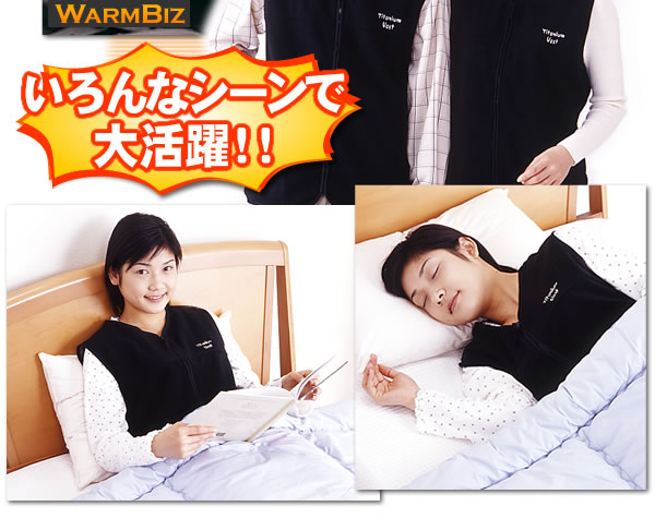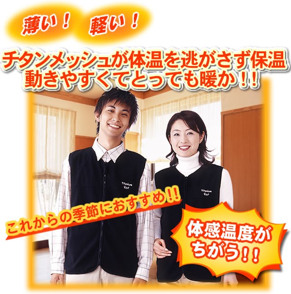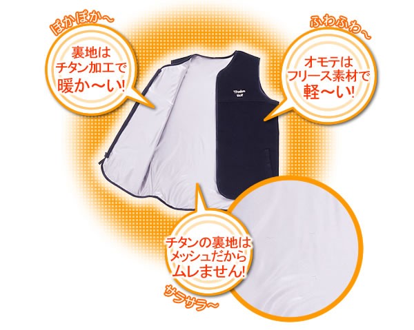 体感温度がちがう!チタンの蓄熱・保温効果でとっても暖かいベスト!!フリースベストの裏地にチタンメッキを使用しました。薄手で軽いのにとっても暖か。また、チタンの裏地がメッシュになっているので通気性があり蒸れません。アウター&ホームウェア、コートの下や就寝時の冷え防止など使い方いろいろ!