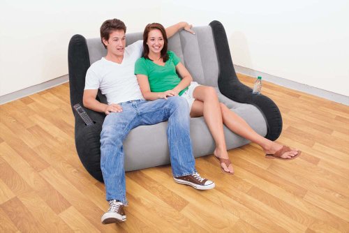 - Feature : Inflatable two-seater sofa lounger--great for game rooms, dorms, kids' rooms, and more / 21 gauge flocked waterproof top, sides and bottom / 2-in-1 valve has extra wide openings for fast filling and quick deflate / Integrated cup holders on each side / Folds compactly for storage; measures 61 x 46 x 29 inches fully inflated
