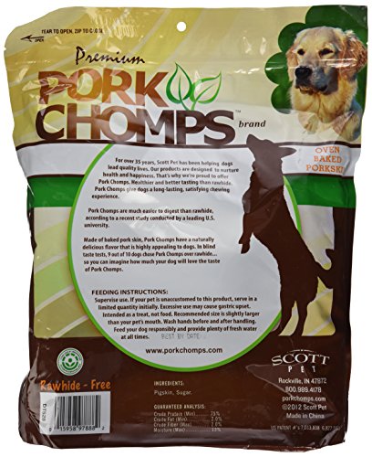 -. Binding : Misc. -. Brand : Scott Pet Products -. Feature : Flavors: Bacon, Chicken and Roasted / Rawhide-Free / Easy to digest / High Protein / Stain-Free on your pets teeth to help maintain a healthy look -. Label : Scott Pet Products -. Manufacturer : Scott Pet Products -. PackageQuantity : 1 -. ProductGroup : Pet Products -. ProductTypeName : PET_SUPPLIES -. Publisher : Scott Pet Products -. Studio : Scott Pet Products -. Title : Scott Pet Products Pork Chomps Baked Knotz Treat, 11"