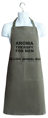 - Great apron for grilling or cooking indoors with a fun play on words: Aroma Therapy for Men and Grilling Animal Meat