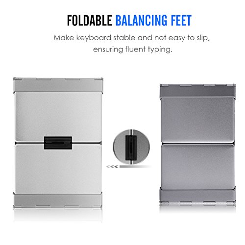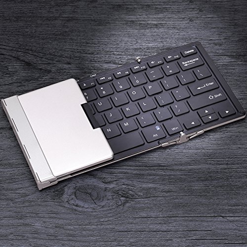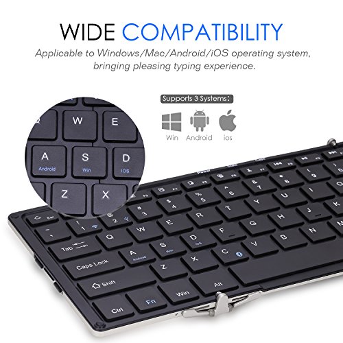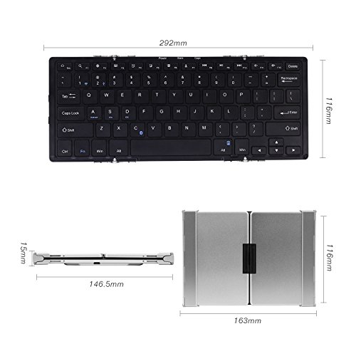 - Feature : Ergonomic & Durable Design: Aircraft-grade aluminum alloy texture for superior durability. anodized matte process creates excellent sense of touch. / iOS / Windows / Android Compatibility: Compatible with 3 major operating system: iOS / Windows/ Android. Supports most bluetooth-enabled devices. / Wired / Wireless Connection Mode: Press FN + C to fast access to bluetooth pairing state. Or connect your devices with USB cable and Press Fn + 2 to operate your keyboard. / Built-in 210mAh rechargeable Li-polymer battery, works for up to 80 hours of effective usage time. Magnetic switch with smart auto sleep / wake feature. / Portable & Lightweight: Tri-fold design, perfect portable Bluetooth 3.0 keyboard with pocket size. Folding size: 6.4"*4.6"*0.6", Open size: 11.5"*4.6"*0.2".