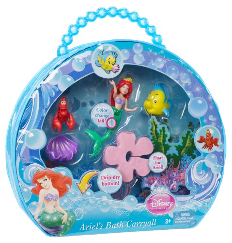 Disney Princess Ariel's Deluxe Bath Bag: Ariel's Deluxe Bath Bag is the perfect bag for bath time. The vinyl bag is bath and mom friendly, containing a mesh bottom for easy drainage and a suction cup and rope for drip drying in the tub. The deluxe bath bag comes with Ariel, who features a special color change pattern on her tail, a floating shell for Ariel to lounge on, a squirty Flounder friend, and other character companions, including Sebastian with a fun pour cup.