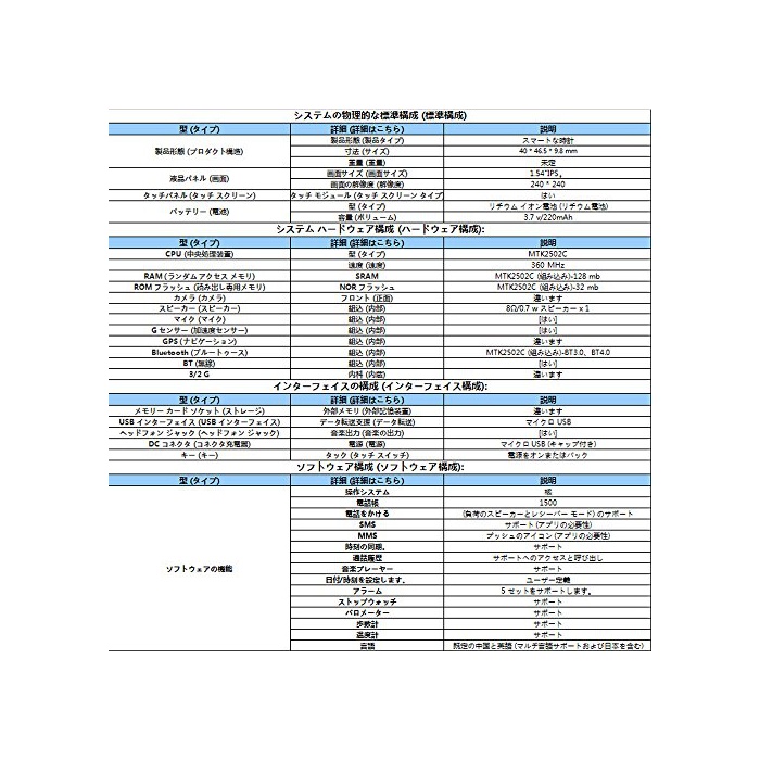 3.기술:Bluetooth기술을 이용하여간단 적으로《스마호》와 접속 성과,가지고 계신 휴대의 일부분으로서,편리한 스마트 라이프를 시작합니다.Android4.2와 IOS8.0이상의 데이 바이스에 대응에서 옵니다.당사 제휴 처(먼저) 공장 에서의 맞춤 모델입니다.종래의 모델보다(부터)도 일본어 표시 정밀도나 감도가 향상.LINE나 Twitter나 Facebook등의 SNS통지도 최대100문자 정도까지 확실히 기독가능입니다.