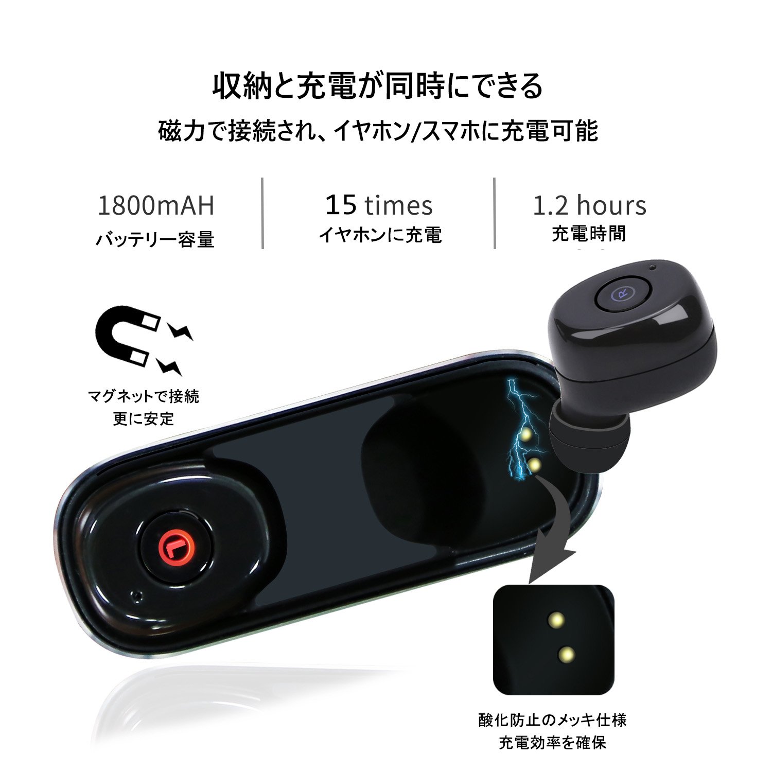 【大容量バッテリー&収納式充電ケース】:1800mAhのバッテリーを搭載しているため、イヤホンを約14回フル充電できるほか、スマホなどのデバイスも充電できます。イヤホンの稼働時間は、音楽の再生で左右それぞれ3時間、さらに、充電ケースを使えば、最大42時間の使用が可能となります。充電ケースはマグネットタイプを採用しており、イヤホンをしっかりと固定できるため収納と充電が同時に可能になり、長時間の持ち運びも安心です。