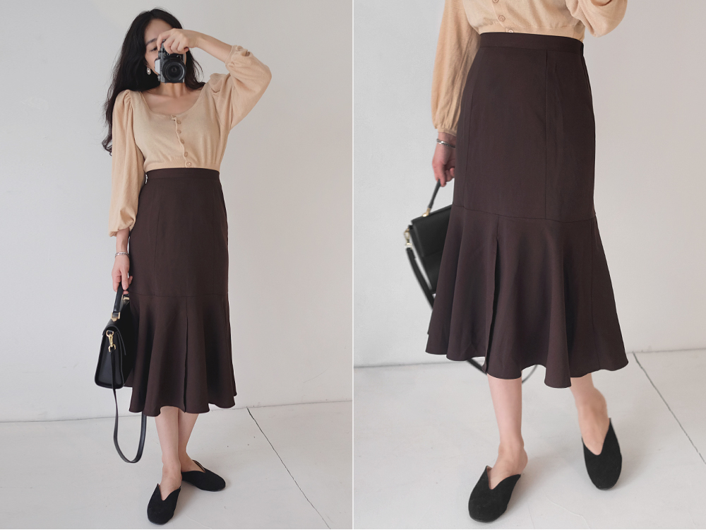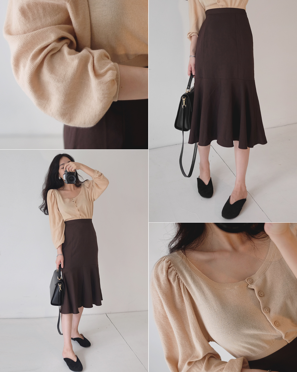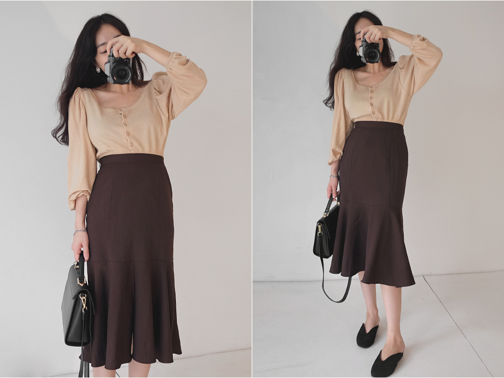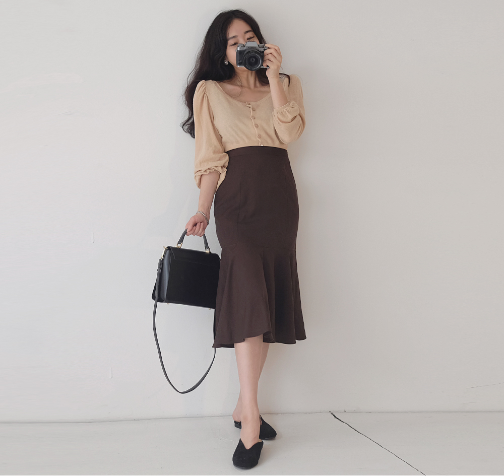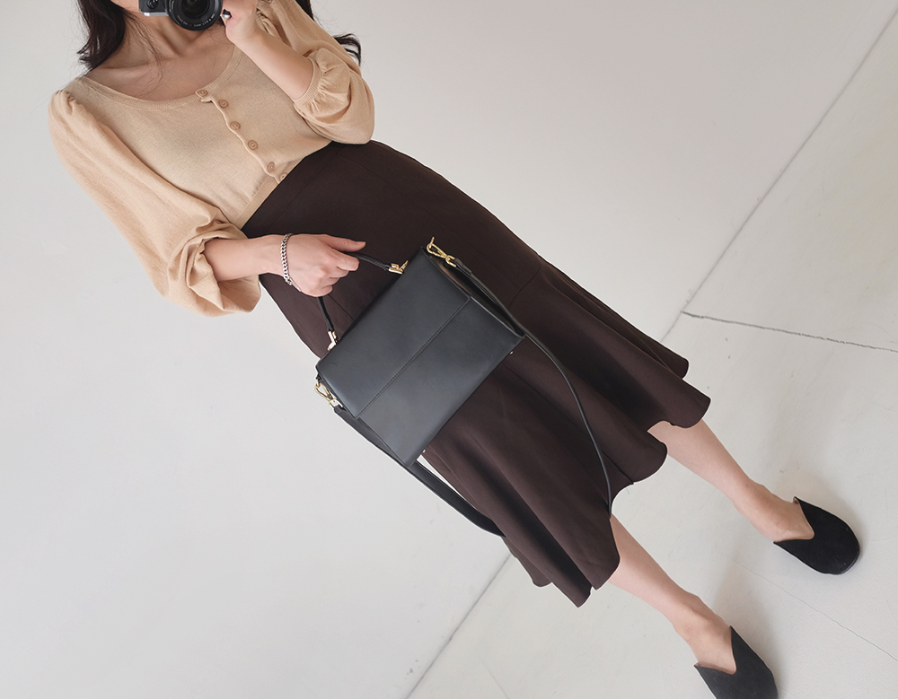 어깨셔링과 벌룬스타일의 소매디테일로 한층더 여성스럽고 로맨틱한 무드의 코디룩으로 완성시켜주구요,