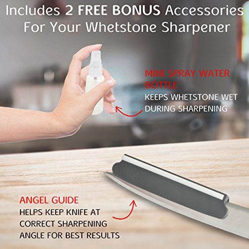 AND THAT’S NOT ALL! - QKT is thrilled to send along a couple of FREE bonus gifts with your purchase: 1. a spray water bottle so that you can sharpen anywhere – you don’t have to be near a sink; and 2. a user-friendly angle guide so that you keep the knife at the correct angle for a perfect pushing position every time; 100% Money-Back if not completely satisfied