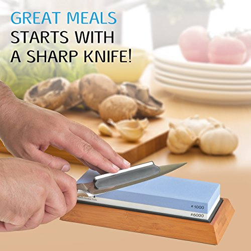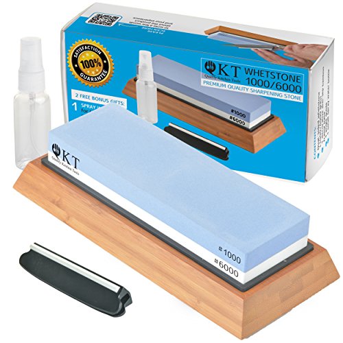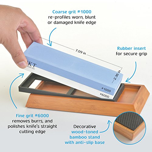 QKT Professional Knife Sharpening Whetstone Dual-Sided 1000/6000 Grit, Bamboo Anti-Skid Base, Easy use with best results!, for Knives: Paring/Boning/Meat Carving/Santoku/Razor/More (LighBlue & white)