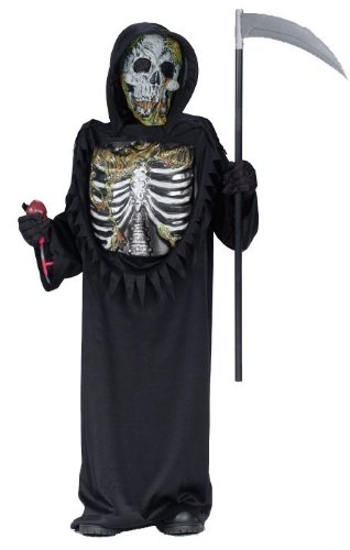 This bleeding chest grim reaper costume for kids includes a black hooded robe, skull mask and chest. The chest piece features an attached hand pump to make the chest bleed with fake blood (included). This bleeding chest grim reaper costume comes in child sizes Medium, Large. The scythe and black gloves are sold separately from this bleeding chest grim reaper costume. Please note: This item's color may vary due to inherent manufacturing variations or your computer monitor's color settings. The item you receive will be identical or substantially similar to the item pictured in this listing.Feature