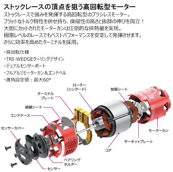 フラットなトルク特性を併せ持ち、操縦性の高さと抜群の伸びを両立。大胆にカットされたモーターカンは圧倒的な排熱量を実現。極限レベルのレースでもベストパフォーマンスを安定して発揮させます。さらに効率を高めたターミナルを採用。 |