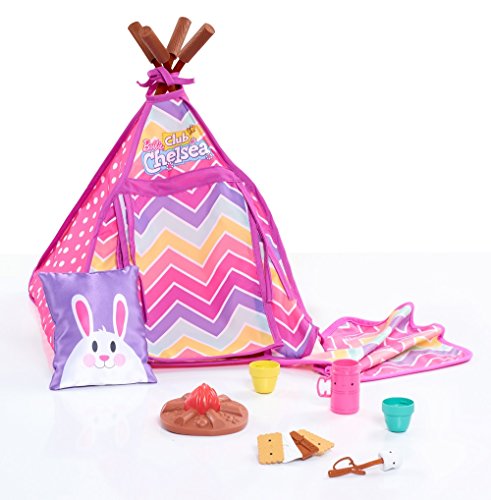 -. Binding : Toy -. Brand : Club Chelsea -. EAN : 0886144626067 -. Feature : One teepee tent. One campfire. Two marshmallow sticks. One smore. One frying pan. One dinner tray. Two pillows. Two blankets. / Chelsea can roast marshmallows over the campfire! Chelsea can cozy up in the teepee tent with matching pillows and blankets. / Use the play frying pan to help Chelsea cook a campfire dinner! / The perfect set for all of Chelsea's camping needs! / Club Chelsea Doll sold separately. Ages 3+ -. Label : Just Play -. Manufacturer : Just Play -. MPN : Camping Set -. PartNumber : Camping Set -. ProductGroup : Toy -. ProductTypeName : TOYS_AND_GAMES -. Publisher : Just Play -. Studio : Just Play -. Title : Barbie Club Chelsea Camping Set 18 Pieces Wildnerness Adventure -. UPC : 886144626067