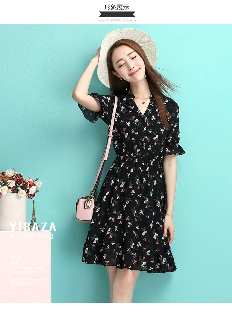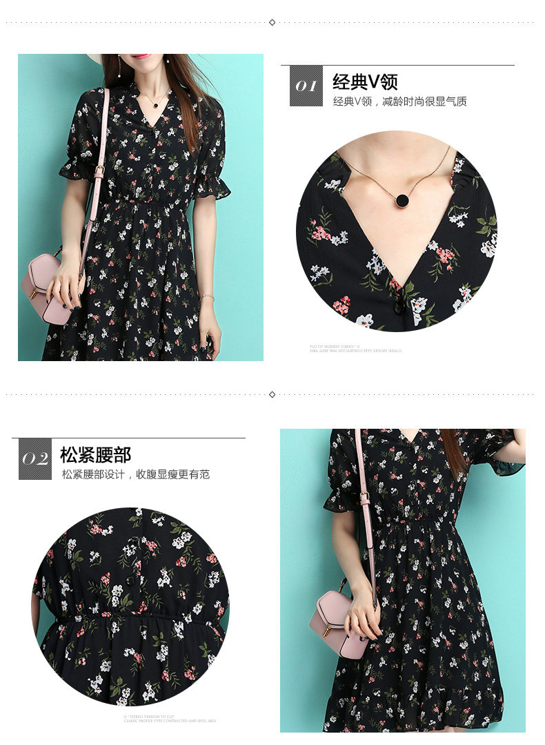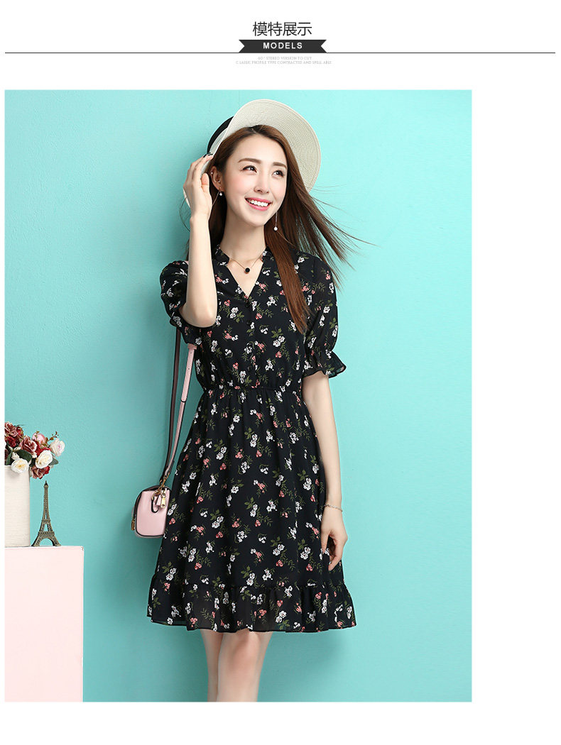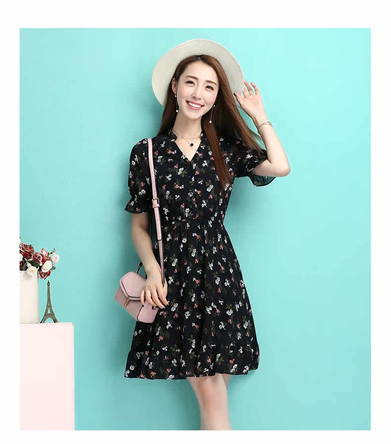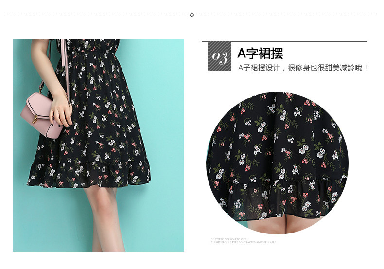 夏季新款女装 学院风黑色小碎花连衣裙 收腰A型公主裙短款