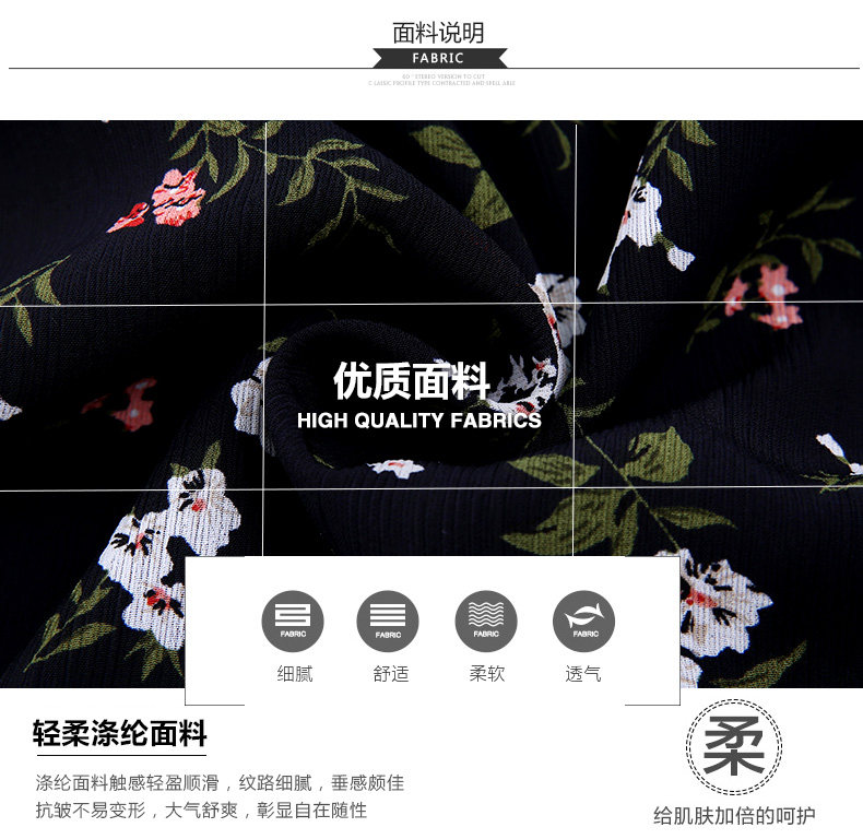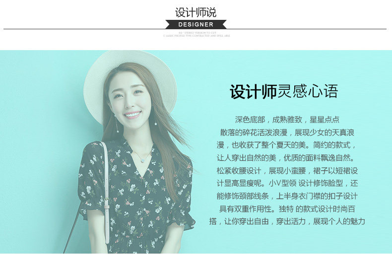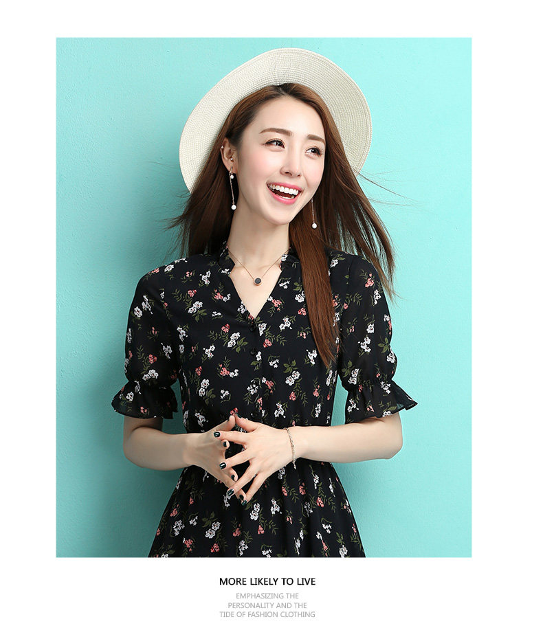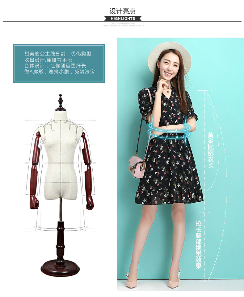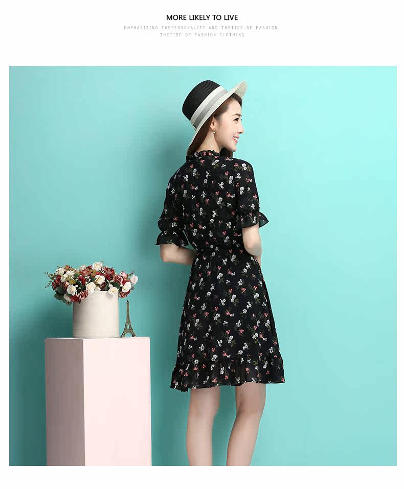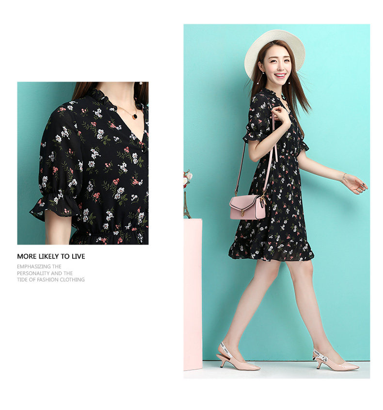 夏季新款女装 学院风黑色小碎花连衣裙 收腰A型公主裙短款