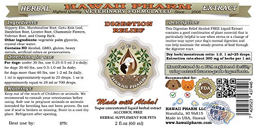 This Digestion Relief for Dogs Veterinary Natural Alcohol-FREE Liquid Extract made from Dried Slippery Elm, Marshmallow Root, Gotu Kola Leaf, Dandelion Root, Licorice Root, Chamomile Flowers, Valerian Root, and Cramp Bark. Digestion Relief is a soothing, calming and supportive formula that has been specially formulated to help maintain and support a healthy and efficient digestive system, enabling your dog to get the very best out of its food. This formulation contains a good combination of plant material that is particularly helpful to use when stress or a change of routine may upset your dog's normal digestion and can help maintain the steady process of food through the digestive tract. Any statements on this page have not been evaluated by the Food and Drug Administration. This product is Herbal Supplement and is not intended to diagnose, treat, cure or prevent any disease. We recommend that you consult with a qualified veterinarian before using this or any other herbal products.Feature