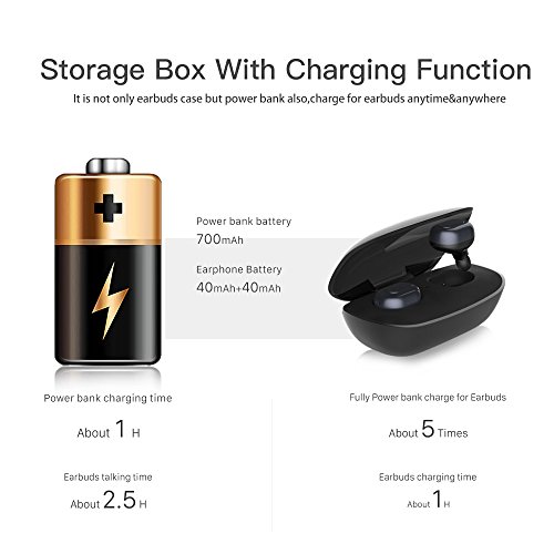 Storage Box with Charging Function :Convenient charging Box-about 1.5hours charge time 700mAh capacity charging box, provides about 5-6 times charge for the earbuds. Combine the battery bank and storage box into a whole, easy to collect and charge for earbuds.it can aslo be used as a power bank charged for cellphone in case of emergency