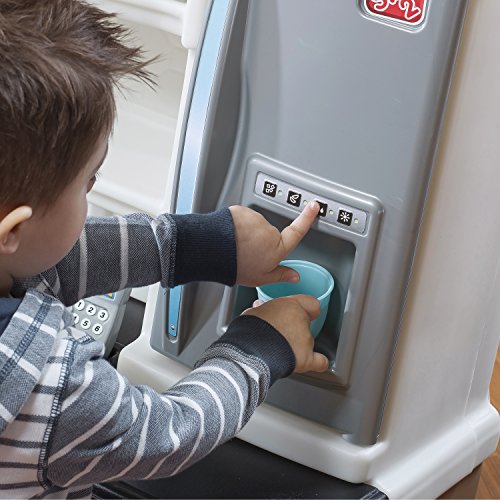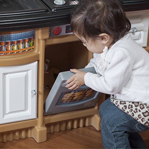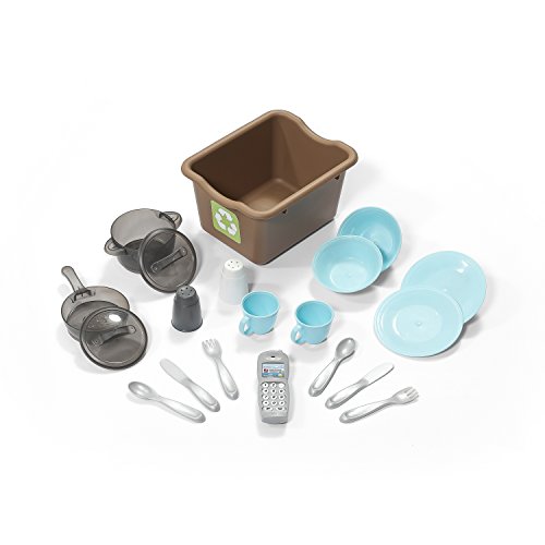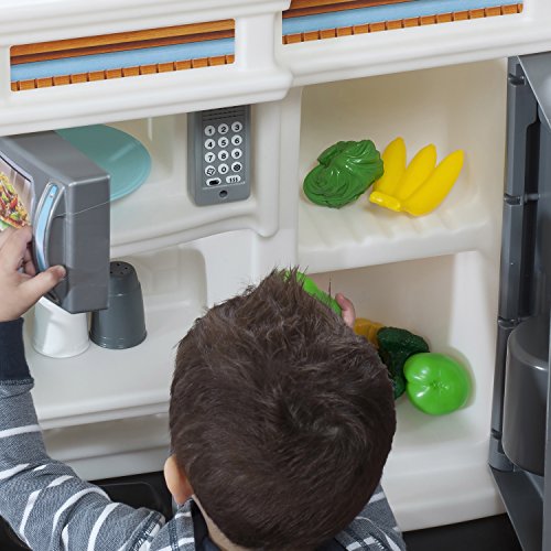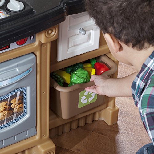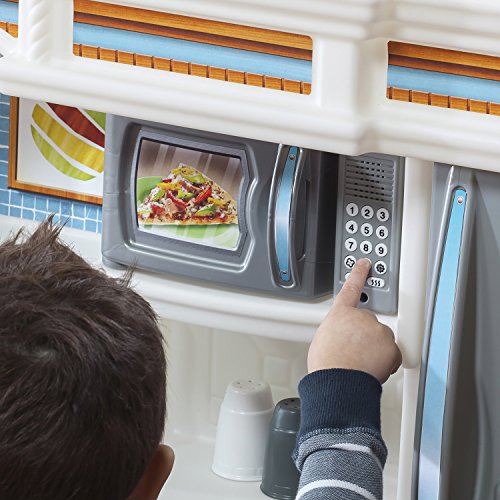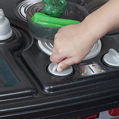 -. Feature : Special frying pan and boiling pot with lid activate electronic frying and boiling water sounds in stove's front burner / Upscale, granite-look counter tops, decorative plate rack, storage shelf and sink with faucet / "Stainless steel" oven, microwave and refrigerator enhance children's play and provide valuable storage space / Recycle bin and pull-out drawer / Includes 20-piece accessory set