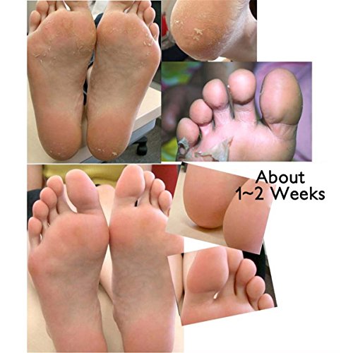 What to expect: After removing the masks and the next day, you feet become white and wrinkled, you may not feel your feet well (your feet may become a bit numb). -The following days, you feet may become very dry. People who respond fast will see their feet peeling, other may see their skin cracking, some may not see these reactions. -Depending on how you react to the masks, you may need 2-3 pairs to achieve the desired results.