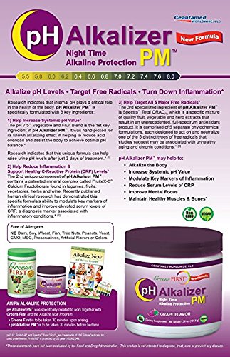 Studio : Greens First Publisher : Greens First Binding : Health and Beauty Product Description Greens First pH Alkalizer PMTM is specifically formulated with pH 7.5TM to help maintain healthy pH levels; FruiteX-B Calcium Fructoborate helps to support healthy levels of C-Reactive Proteins (CRP), a diagnostic marker associated with inflammatory conditions; and SpectraTM Total ORACFN which may help to target the five major types of free radicals that studies suggest may be associated with unhealthy aging and chronic conditions. The difference between acute and chronic inflammation is that acute inflammation is typically short, from a recent injury while chronic inflammation is persistent and long-lasting. Whole-body inflammation refers to chronic, imperceptible, low-level inflammation. Mounting evidence suggests that over time this kind of inflammation sets the foundation for many serious, age-related diseases including heart disease and other chronic illnesses. If you have chronic inflammation and suffer from a recent injury, this may cause more pain and lengthen healing time. 0