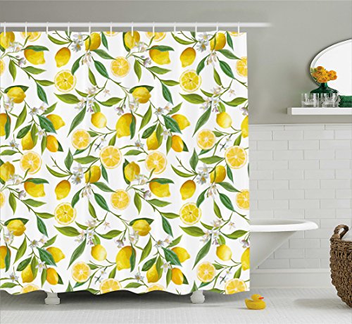Nature Shower Curtain by Ambesonne, Exotic Lemon Tree Branches Yummy Delicious Kitchen Gardening Design, Fabric Bathroom Decor Set with Hooks, 70 Inches, Fern Green Yellow White