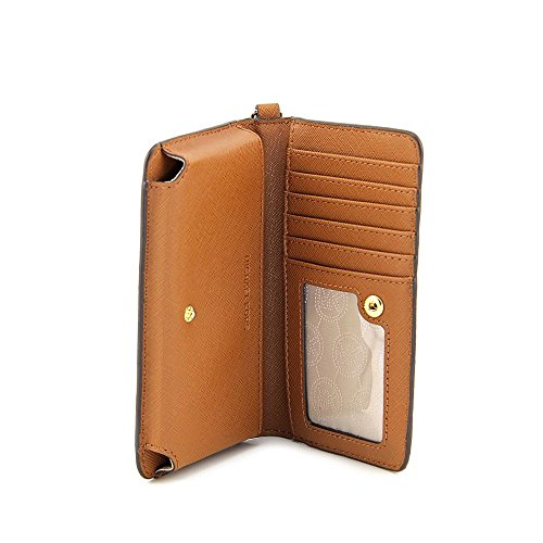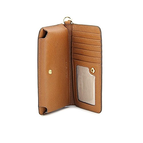 -. Feature : Leather Jet Set Travel Slim Tech Phone Case Wristlet Cllutch Genuine Saffiano Leather Goldtone Hardware Snap Closure Interior has 5 Credit Card Slots and One Window View Slot Open Gusseted Pocket for Bills or Iphone And 1 Bill Flat Pocket Exterior Large Gusseted Zip Pocket Removable Wristlet Strap Measures Approximately 6 1/8" (W) X 3 3/8" (H) X .75" (D) Color: Brown