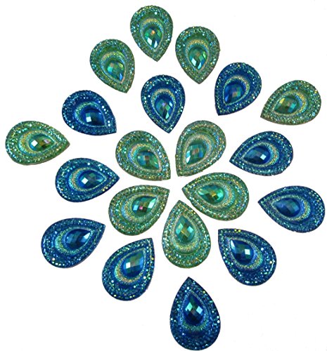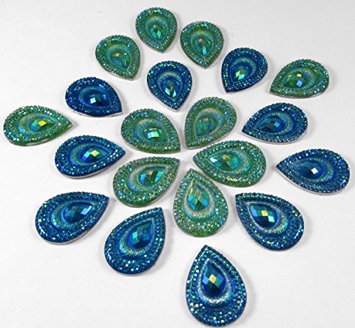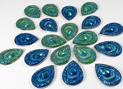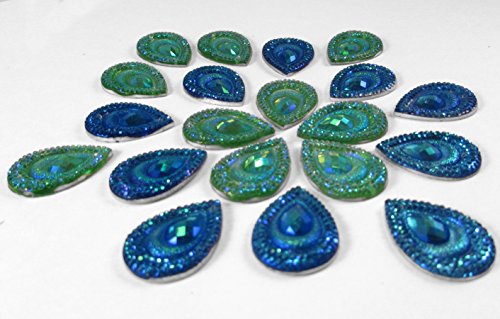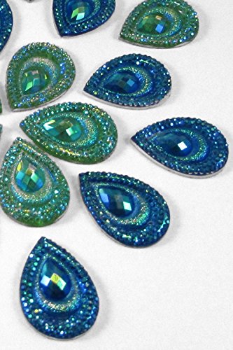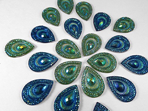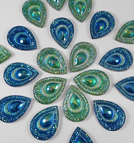 20 Pcs Peacock Blue & Green, Iridescent Flat Back Teardrop Beads Cabochons