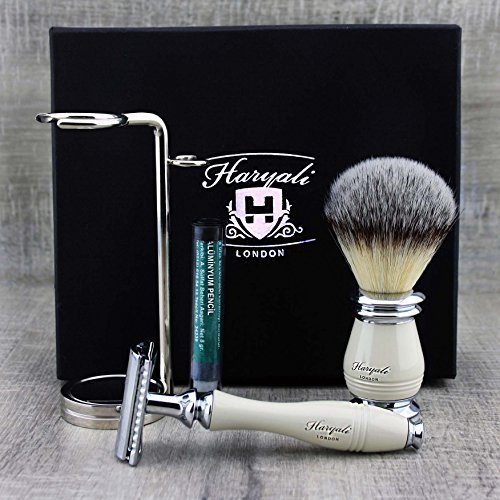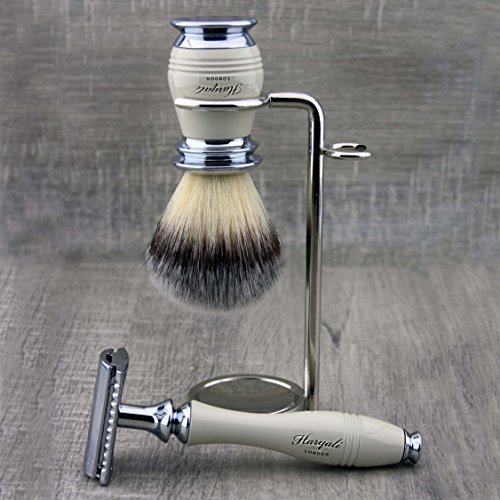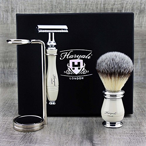 Elegant 3Pcs Shaving Set for Men >Synthetic Brush, DE Safety (Blades Not Included) & Dual Stand|Free Alum Stick Included