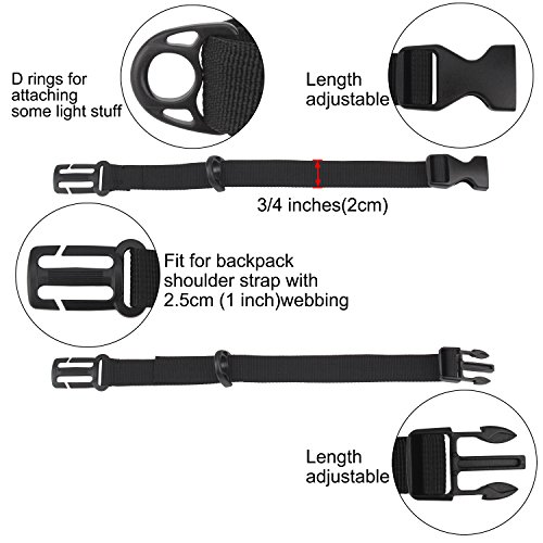 -. Feature : Keeps shoulder straps of your backpack securely in place, and gives your hands free. / Made of 3/4" wide Polypropylene Webbing, durable to use. / Quick Release Buckle, easy to buckle and unbuckle; D rings for attaching some light stuff. / Length Adjustable From 4" to 32". / Fits Backpack with Shoulder Straps Less Than 1 Inch Wide
